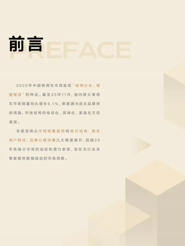 这份报告以扎实的数据支撑、清晰的逻辑拆解,既复盘了2025年行业变迁的核心脉络,又精准预判了2026年市场趋势,无论是主机厂的产品规划、经销商的营销布局,还是行业研究者的趋势研判,都能从中获取极具价值的洞察。对于想要在结构分化的市场中找准定位、抢占先机的行业参与者而言,这份报告无疑是一份不可或缺的战略指南。
