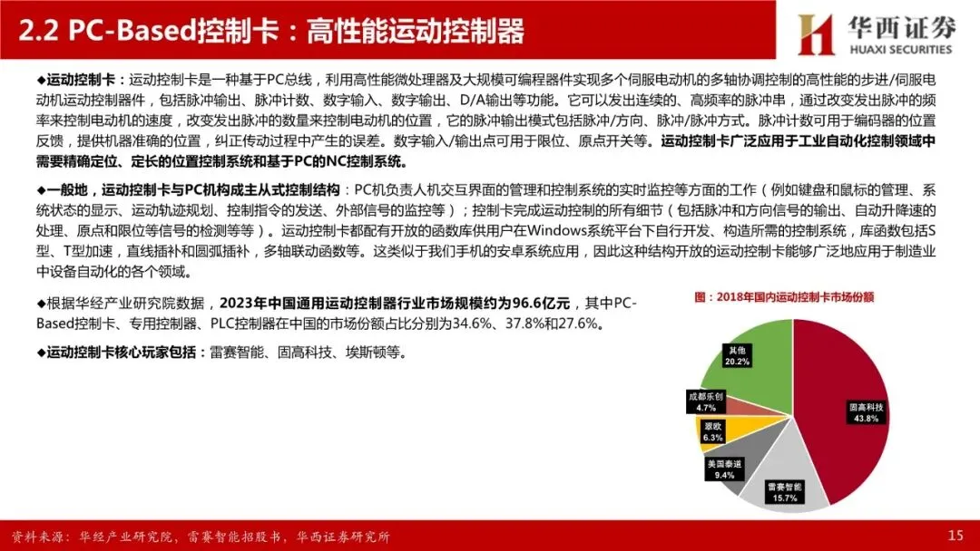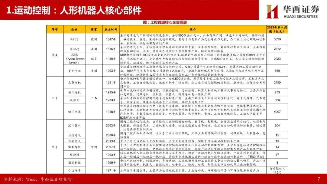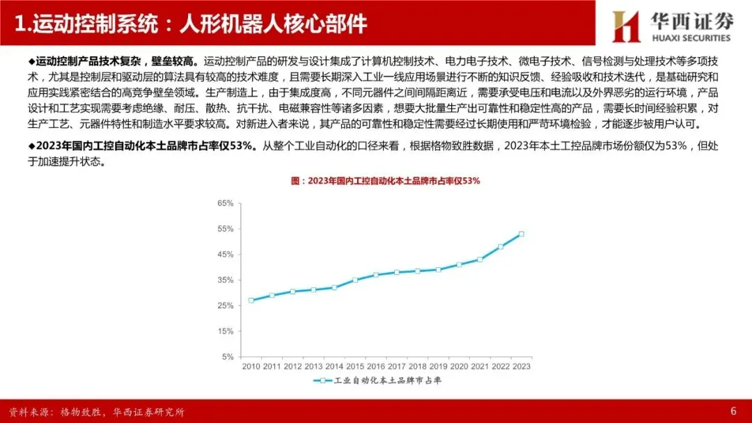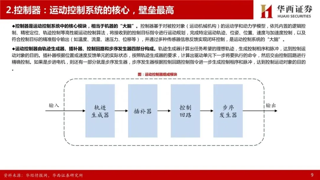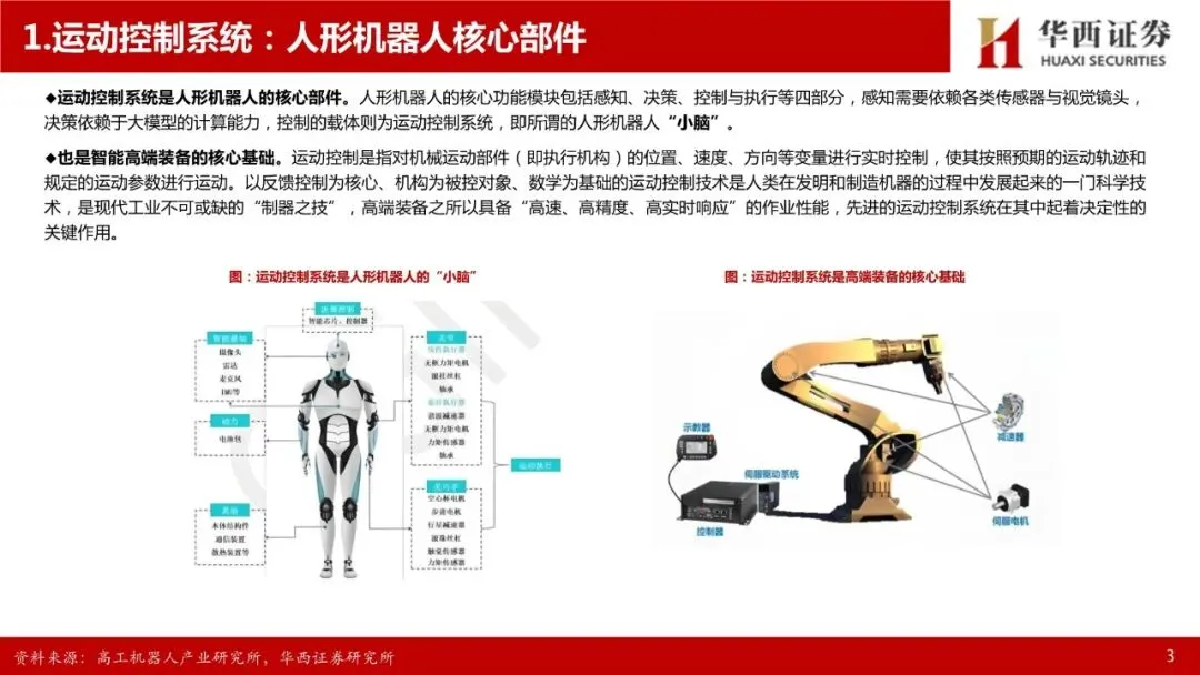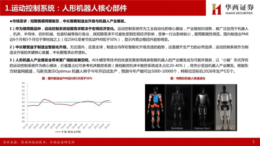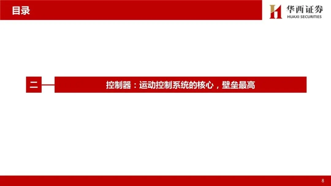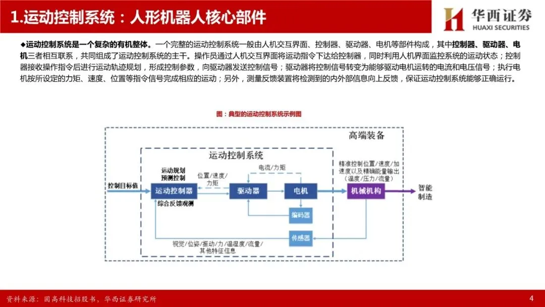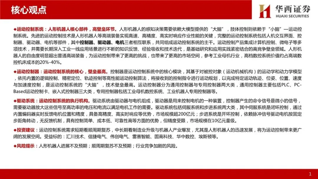 运动控制系统:人形机器人核心部件,高壁垒环节。人形机器人的感知决策需要依赖大模型提供的“大脑”,肢体控制则依赖于“小脑”——运动控制系统。先进的运动控制技术是人形机器人等高端装备实现高速、高精度、高实时响应作业性能的关键,完整的运动控制系统包括人机交互界面、控制器、驱动器、电机等部件,其中控制器、驱动器、电机三者相互联系,共同组成运动控制系统的主干。运动控制产品集成计算机控制、微电子等多项技术,并需要长期深入工业一线应用场景进行不断的知识反馈、经验吸收和技术迭代,是基础研究和应用实践紧密结合的高竞争壁垒领域。人形机器人的自由度明显超出普通高端装备,为运动控制带来了更高的挑战,也带来了更高的市场空间,参考工业母机行业,高档数控系统价值约占高端数控机床成本的20%-40%。