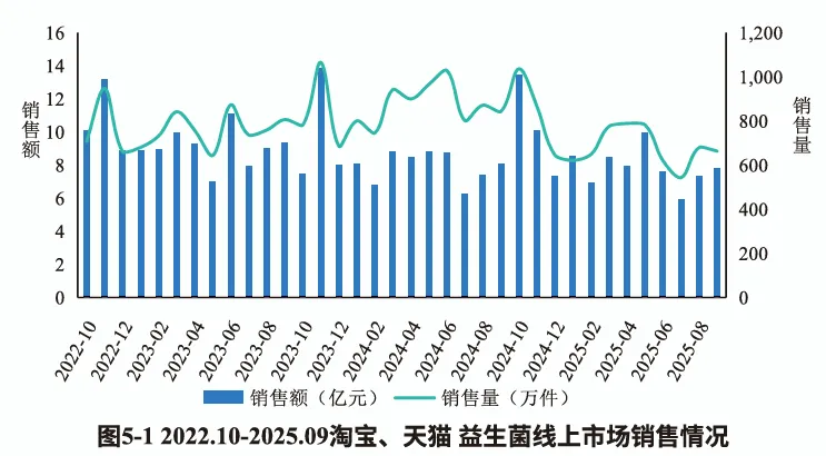 从益生菌产品线上市场情况(国内)来看,通过对2022年10月至2025年9月益生菌市场淘宝天猫平台销售数据的统计分析,发现:淘宝和天猫平台的益生菌市场在2024滚动年经历了销售额的下滑和销量上升,但在2025滚动年情况则相反,销售额同比小幅上升0.5%,且销量出现下滑。随着消费者认知不断提升和技术升级,品牌产品溢价能力增强;同时在直播电商的催化下,大容量、多包装、组合装产品更为畅销。