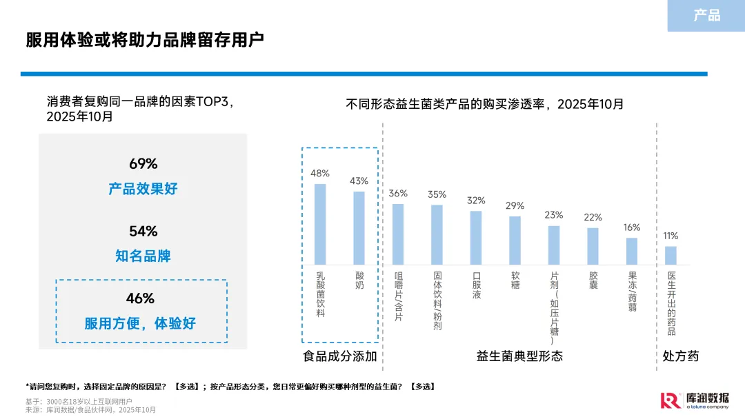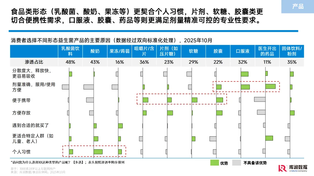 剂型作为消费者服用体验的重要一环,调研结果发现食品类形态(乳酸菌、酸奶、果冻等)更契合个人习惯,片剂、软糖、胶囊类更切合便携性需求,口服液、胶囊、药品等则更满足剂量精准可控的专业性要求。良好的日常使用体验——包括口感、便携性和剂量设计——是推动消费者从“有效”转向“爱用”的关键环节。