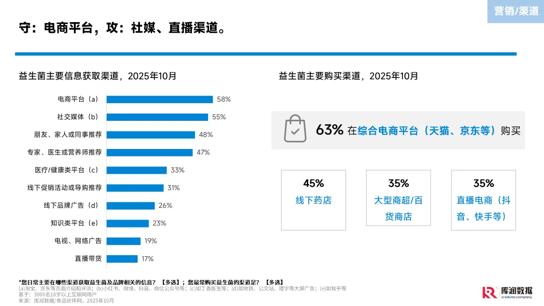 消费者购买益生菌时,主要信息获取渠道和主要购买渠道又有哪些趋势?电商页面直接承载产品介绍与销售转化,而小红书、抖音等社交平台则承担了前期用户教育、内容种草与品牌塑造的关键作用。在购买渠道中,线上渠道仍为主导,62.8%的消费者会在综合电商平台(天猫、京东等)上购买益生菌产品。