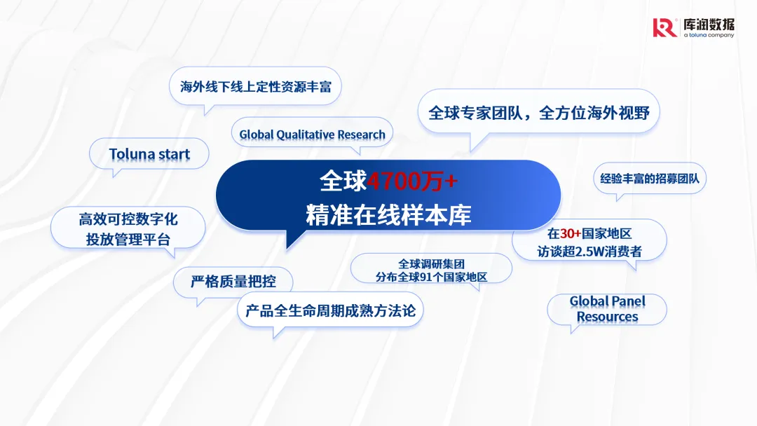 库润数据(KuRunData)隶属于Toluna集团,积累了全球4700万+的精准在线样本库,业务范围覆盖全球91+国家和地区。库润数据深耕全球市场调研领域,依托全球化团队与执行网络,致力于用真实、精准、高效的一手数据,帮助中国品牌穿透文化隔阂,直达市场需求本质,实现科学决策与高效增长。我们的核心优势,也正是品牌破局出海困境的关键助力: