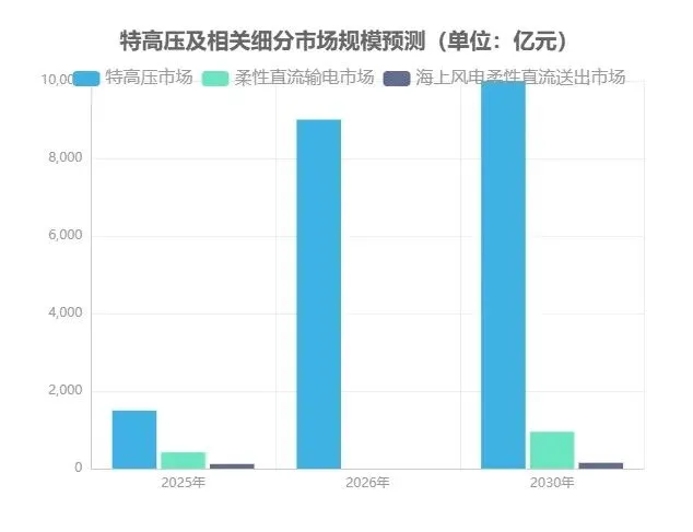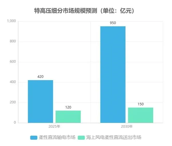 2025 年国内特高压市场规模已突破 1500 亿元,2026 年投资规模有望接近 9000 亿元,中期将维持万亿级投资水平至 2030 年后。细分领域中,柔性直流输电市场预计从 2025 年的 420 亿元增长至 2030 年的 950 亿元,年复合增长率约 17%。