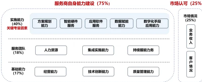 为解决供需错配,报告构建了服务商能力评价框架,涵盖基础能力(17%)、服务团队(18%)、实施能力(40%)、市场情况(25%)四大维度,共23个指标。实施能力是核心,包括方案规划、智能硬件服务、应用软件服务、数据赋能和数字化手段应用五要素。