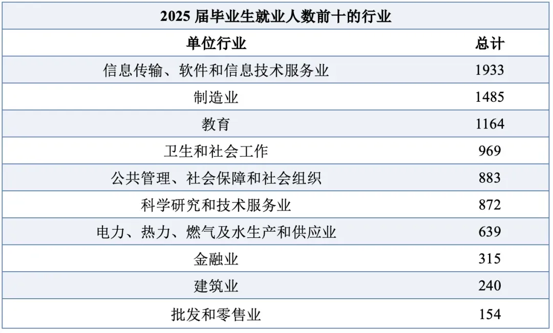 行业分布呈现 “三主三辅” 格局,80% 毕业生投身国家重点发展领域,与学校 “强工、精医、重交叉” 的学科布局高度契合: