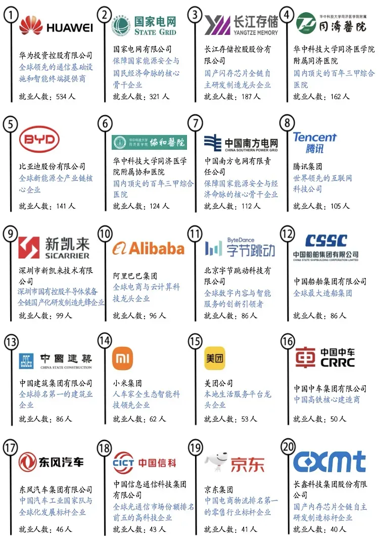 体制内(含央企、国企、机关事业单位)就业占比 35%,其中国家电网、南方电网、航天科技集团等央企录用超 800 人,事业单位(高校、医院、科研院所)录用超 1200 人; 高薪企业(互联网大厂、芯片半导体、新能源)就业占比 42%,华为、腾讯、比亚迪、长江存储等企业录用超 1000 人,实现 “稳定” 与 “高薪” 的平衡。 - TOP20 录用单位凸显行业地位