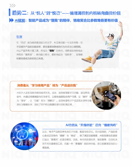 从“悦人”到“悦己”消费动机从追求外界认同转向自我价值实现,消费者更愿为健康、便利、文化认同等“与我相关”的产品和服务付费,AI赋能的智能产品成为“懂我”的陪伴。