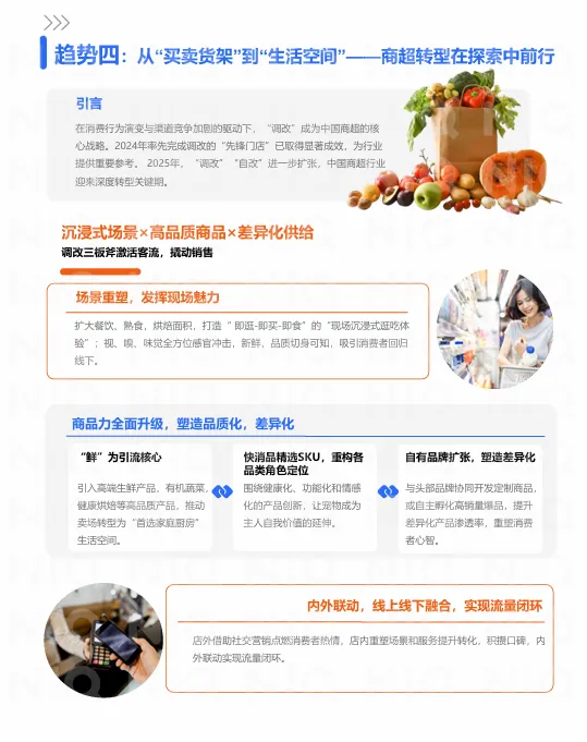 从“买卖货架”到“生活空间”商超通过场景重塑、商品升级和差异化供给,打造沉浸式体验,强化供应链竞争力和零供协作,以提升消费者信任和忠诚度。