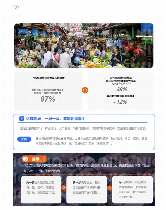 下线市场的确定性增量政策、物流和消费升级推动下沉市场成为增长引擎,品牌需通过“一县一策”本地化策略,开发契合县域需求的产品和服务,科技耐用品下沉则从“卖设备”转向“科技邻居”模式。