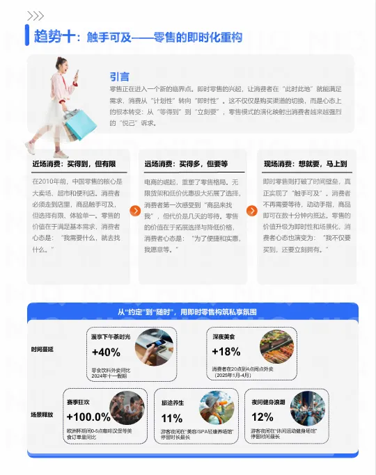 零售的“即时化”重构即时零售突破时间壁垒,从“计划性”转向“即时性”,满足消费者“此时此地”的需求,未来零售将迈向“智场”,借助AI和数据实现需求预判和场景化服务。