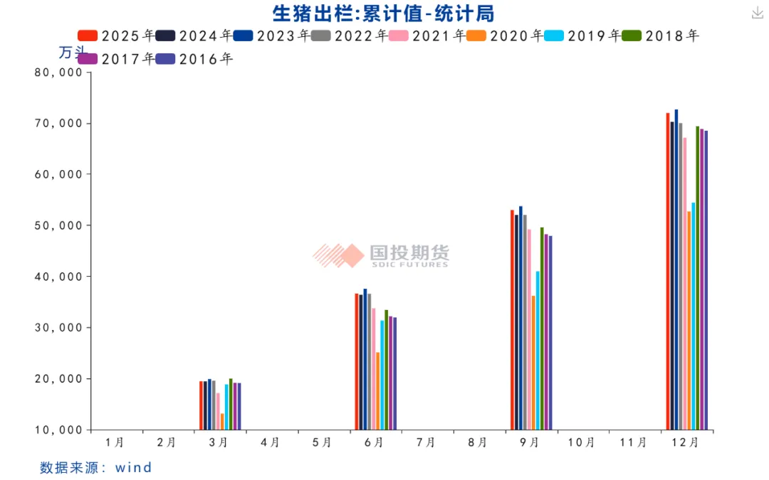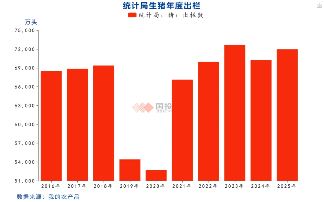 从生猪出栏量数据来看,2025年生猪出栏量71973万头,2024年为70256万头,2025年全年生猪出栏同比增加2.4%,但低于2023年的72662万头,为过去10个年份当中历史第二高。2025年生猪出栏量压力持续释放,导致下半年猪价跌至10~11元/公斤历史低位区间。