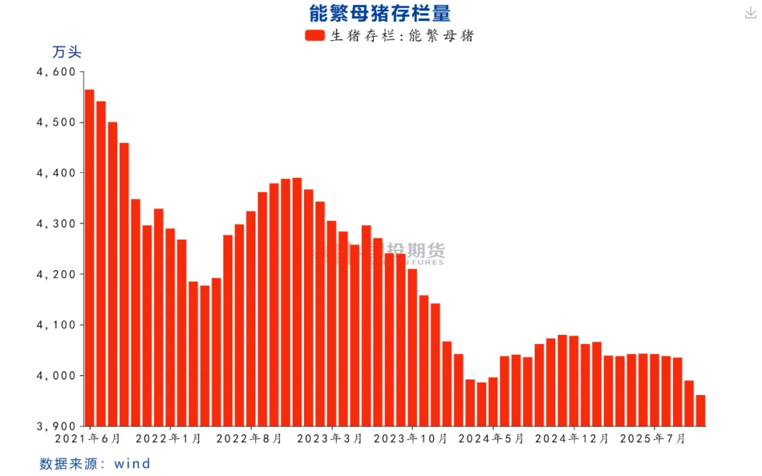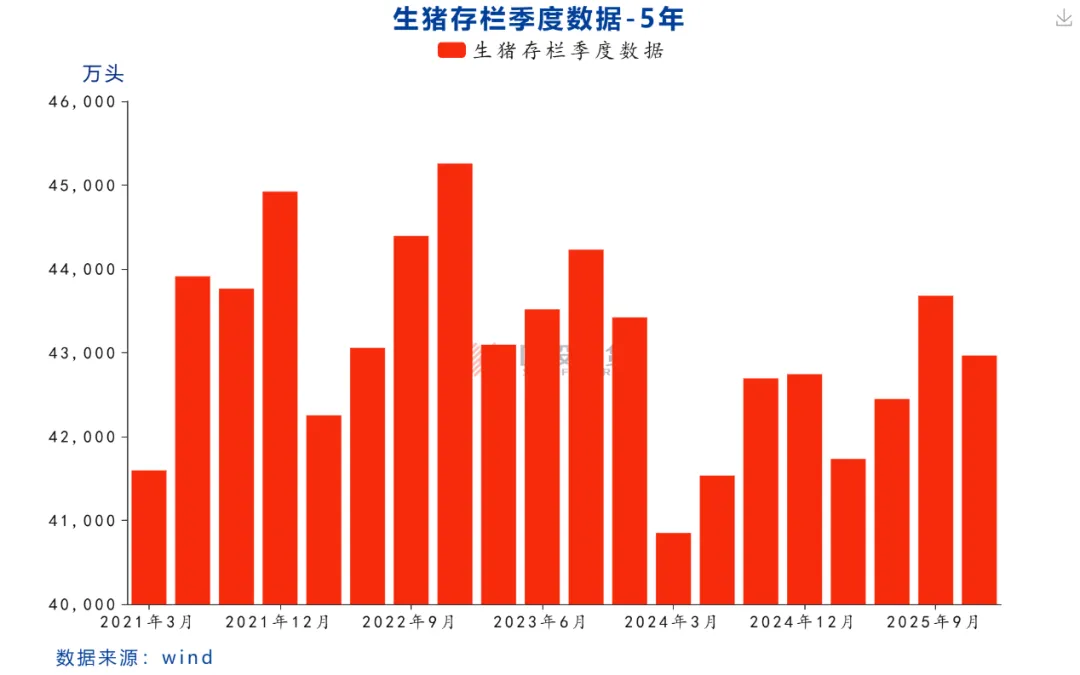 2025年末,全国生猪存栏42967万头,比上年末增加224万头,增长0.5%。其中,能繁母猪存栏3961万头,减少116万头,下降2.9%,目前为正常保有量的101.6%。此前,官方数据显示截至3季度末,能繁母猪存栏4035万有,10月末能繁母猪存栏量3990万头,11月数据未公布,四季度能繁母猪存栏去化加速,受益于国家对生猪行业反内卷的倡导以及生猪行业自身亏损幅度有所扩大。