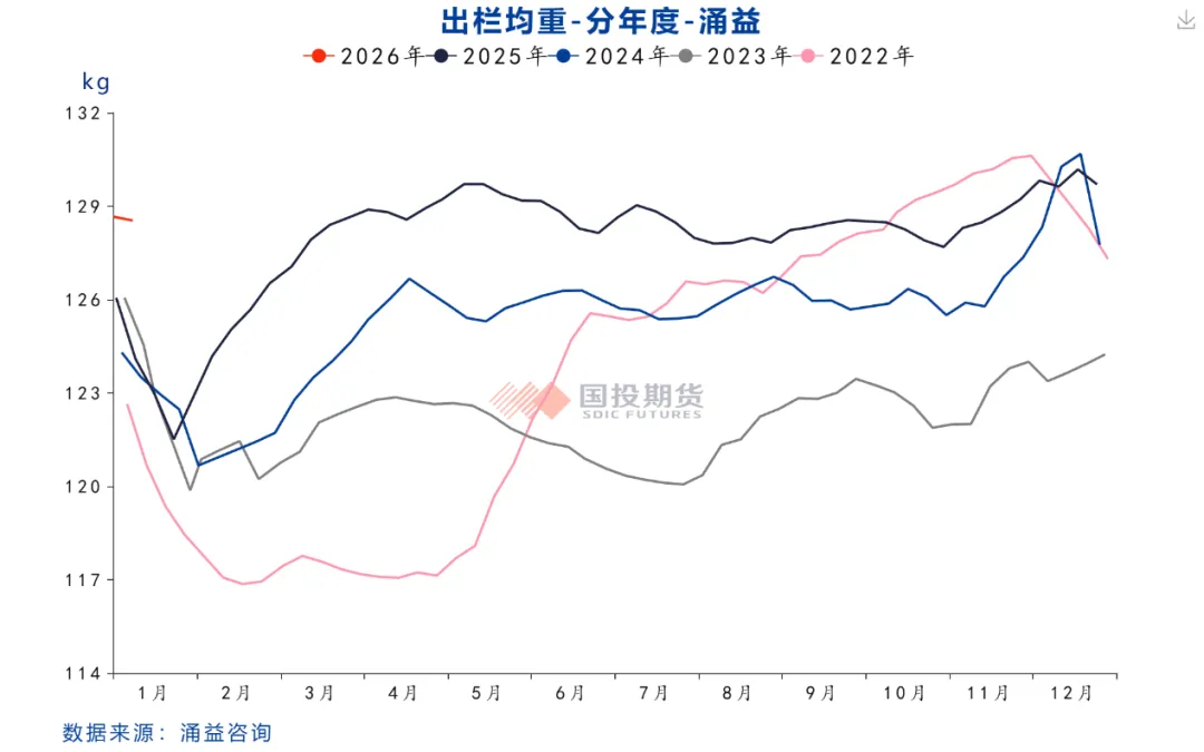 从猪肉产量来看,2025年猪肉产量同比增速4.1%,高于2025年生猪出栏量增速2.4%,主要因2025年全年生猪出栏体重持续处于较高水平。涌益数据显示,2025年生猪出栏体重处于近4年同期最高水平。随着猪价来到本轮熊市周期底部位置附近,未来预计行业体重存在去库空间。