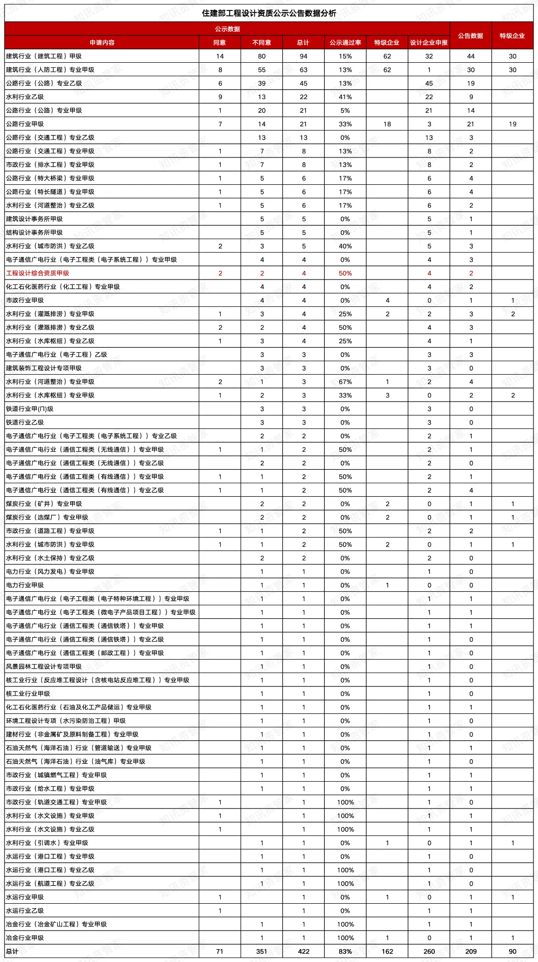 ·审批数据特征:监理资质公示通过率为24%,设计资质为16.8% 。建筑业企业资质在剥离承诺制基数后,公示通过率为12.5%。