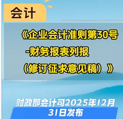 为适应社会主义市场经济发展,完善我国企业会计准则体系,提高财务报表列报质量和会计信息透明度,同时保持我国企业会计准则与国际财务报告准则的持续趋同,我们于近期对《企业会计准则第30号——财务报表列报》及配套利润表格式进行修订,草拟了《企业会计准则第30号——财务报表列报(修订征求意见稿)》,以及与之配套的《一般企业利润表的列报格式和列报方法(修订征求意见稿)》、《金融企业利润表的列报格式和列报方法(修订征求意见稿)》、《合并利润表的列报格式和列报方法(修订征求意见稿)》。现印发你们,请组织征求意见,并于2026年2月9日前将意见反馈至财政部会计司,反馈意见材料中请注明联系人及联系方式。