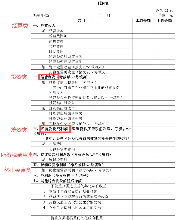 将当期损益分为经营、投资、筹资、所得税费用、终止经营五个类别,清晰区分不同经济活动的利润来源。例如:
