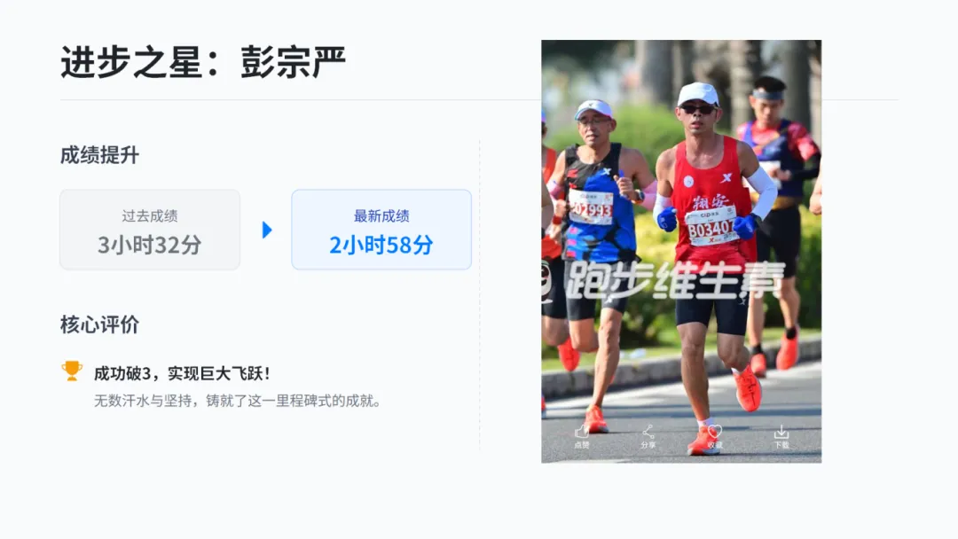 陈青山的进步堪称惊艳,足足提升了 72 分钟!说他是今年协会进步最快的选手,一点都不为过。我没细问他的跑量,但能肯定的是,他付出的汗水远比去年多得多。