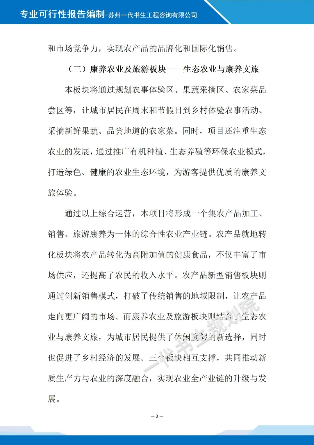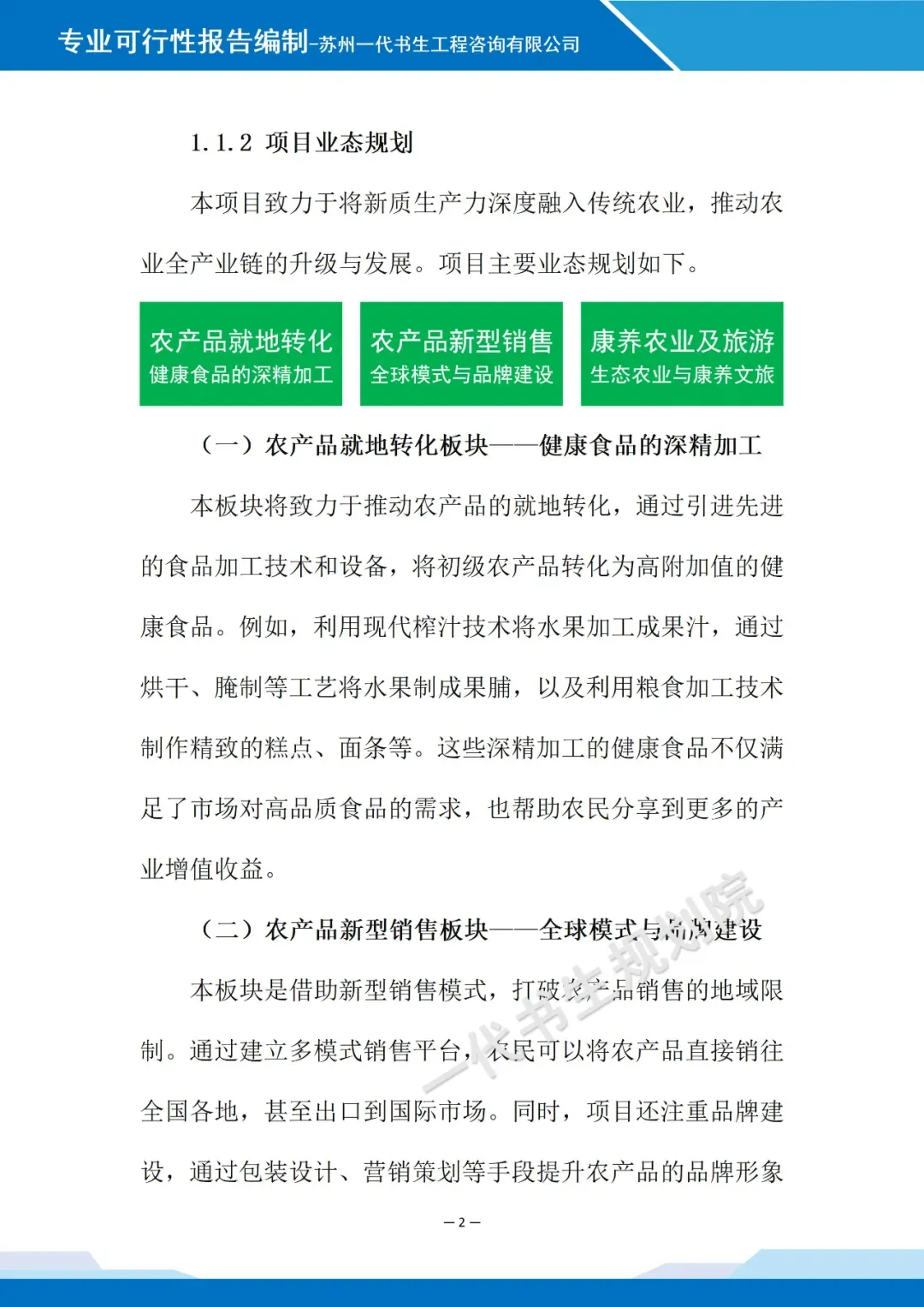(一)农产品就地转化板块——健康食品的深精加工 本板块将致力于推动农产品的就地转化,通过引进先进的食品加工技术和设备,将初级农产品转化为高附加值的健康食品。例如,利用现代榨汁技术将水果加工成果汁,通过烘干、腌制等工艺将水果制成果脯,以及利用粮食加工技术制作精致的糕点、面条等。这些深精加工的健康食品不仅满足了市场对高品质食品的需求,也帮助农民分享到更多的产业增值收益。 (二)农产品新型销售板块——全球模式与品牌建设 本板块是借助新型销售模式,打破农产品销售的地域限制。通过建立多模式销售平台,农民可以将农产品直接销往全国各地,甚至出口到国际市场。同时,项目还注重品牌建设,通过包装设计、营销策划等手段提升农产品的品牌形象和市场竞争力,实现农产品的品牌化和国际化销售。 (三)康养农业及旅游板块——生态农业与康养文旅 本板块将通过规划农事体验区、果蔬采摘区、农家菜品尝区等,让城市居民在周末和节假日到乡村体验农事活动、采摘新鲜果蔬、品尝地道的农家菜。同时,项目还注重生态农业的发展,通过推广有机种植、生态养殖等环保农业模式,打造绿色、健康的农业生态环境,为游客提供优质的康养文旅体验。