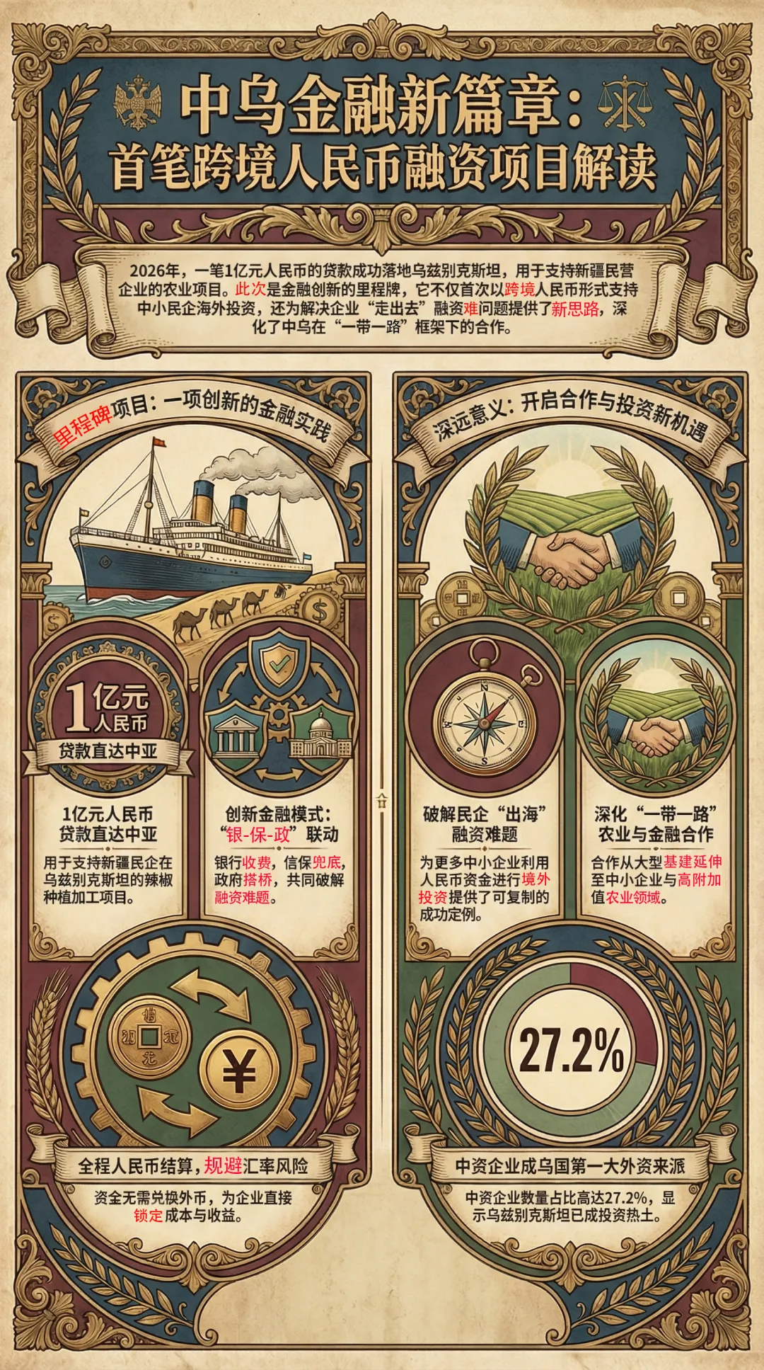 2026年1月19日,中国新疆生产建设兵团商务局推动的首笔跨境人民币融资项目在乌兹别克斯坦正式落地。这项融资由工商银行新疆分行提供人民币贷款1亿元,并通过中国出口信用保险公司新疆分公司提供保险支持,帮助兵团旗下某民营企业在乌兹别克斯坦的农业项目获得出口买方信贷资金。该项目成为新疆地区首笔以跨境人民币方式发放、专用于中小民营企业海外项目的贷款,填补了民营企业境外融资的空白,为解决“走出去”企业融资难、融资贵问题提供了可复制、可推广的示范案例。本文将从项目详情、兵团商务局角色、跨境人民币创新、乌方政策配合、中乌合作意义以及对中国投资者启示六个方面,对这一事件进行深入解读。融资项目亮相:金额、主体与产业背景