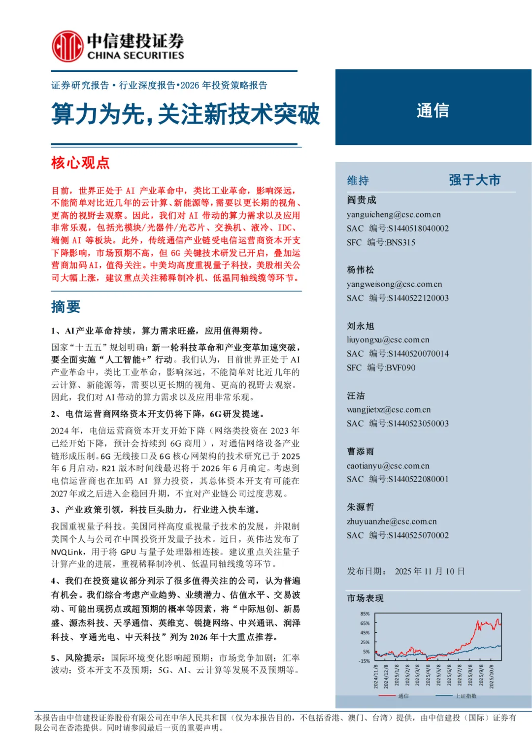 关注我们,后台回复“202601194”就可以获取《中信建投:通信行业2026年投资策略报告:算力为先,关注新技术突破》(完整版) 的全文下载链接。