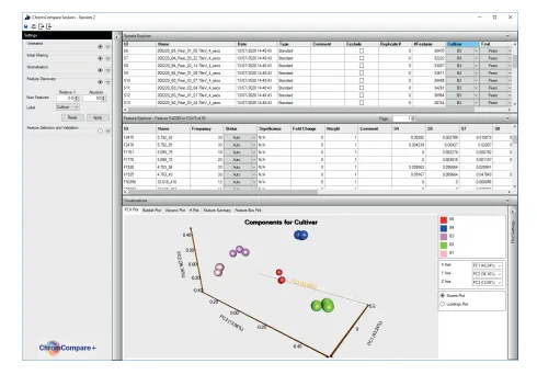 原始数据直接导入到ChromCompare+中,以发现品种间的差异。通过“Feature Discovery”是为了从总共超过30,000个特征中选择50个最显著的差异特征(图2)。“Feature Explorer”突出显示了导致色谱图之间显著差异的保留时间和离子,使分析人员能够快速查看结果并进行鉴定。