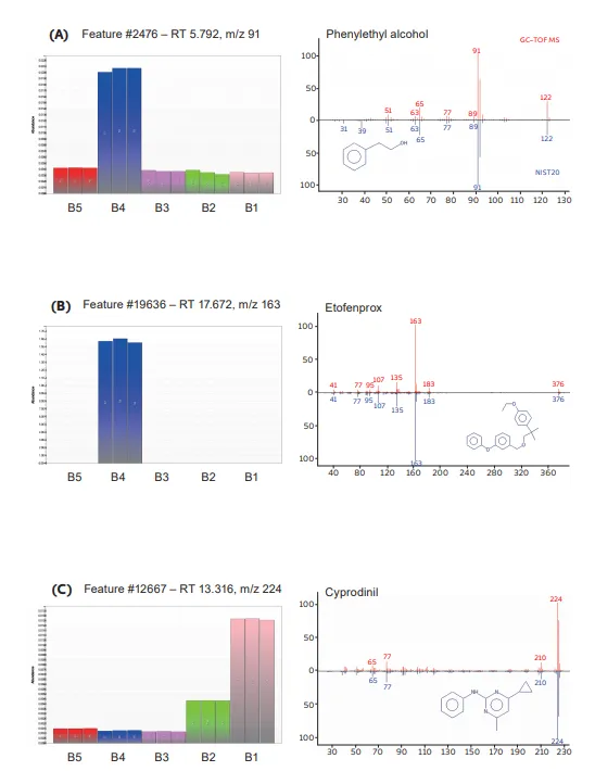 例如,发现品种B4的苯乙醇含量明显高于所有其他样品(图3A)——这是一个重要的特点,因为它可以提供一种特有的花香和甜味。[2]这种非目标工作流程对于识别潜在有害化合物也很有用;例如,杀虫剂醚菊酯仅在品种B4中发现(图3B),而品种B1的一个关键区别是杀真菌剂嘧菌环胺的含量增加。(图3C)