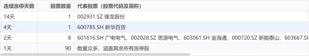 :在锋龙股份(14板)与新华百货(4板)之间存在巨大的连板断层,缺少5板至13板的个股。这表明市场接力情绪在极高位置出现谨慎,资金更倾向于挖掘首板或博弈2板。 - 低位基础广泛