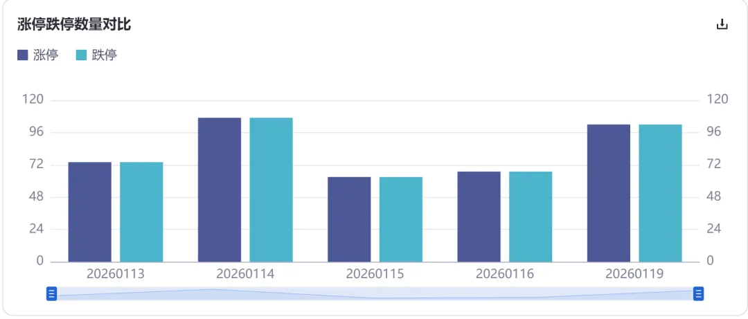 将当前数据与近期历史进行对比。从涨跌停统计看,1月14日涨停107家、跌停19家,情绪达到一个小高潮;随后两日涨停家数锐减至63家和67家,跌停家数增至71家和57家,市场出现快速退潮迹象;而1月19日涨停再度回升至102家,跌停降至30家1。这呈现出一个“高潮(14日)→ 快速退潮(15、16日)→ 情绪修复(19日)”的波动路径。这种剧烈波动符合退潮期或高潮期末端的特征,市场情绪不稳定,容易大起大落。