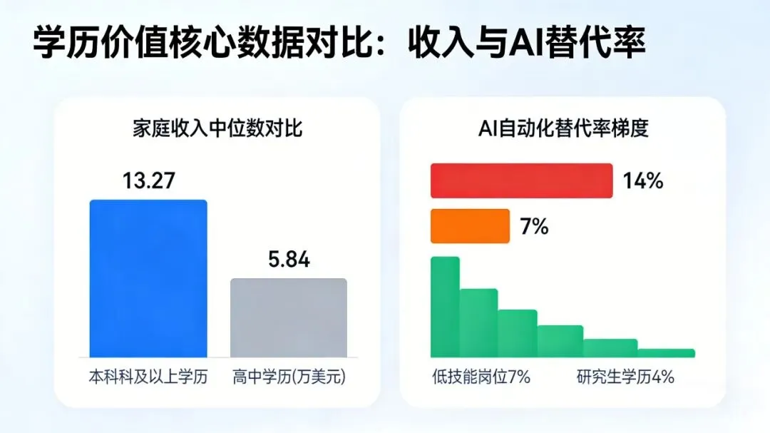 这意味着,在AI时代,高等教育的核心价值正从单纯的“提升收入上限”,转向更关键的“守护职业安全下限”。它不再只是一张通往高薪的入场券,更是一份抵御被技术浪潮淘汰的保险。