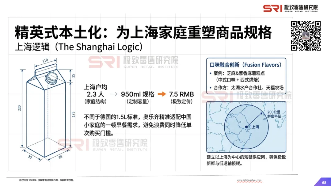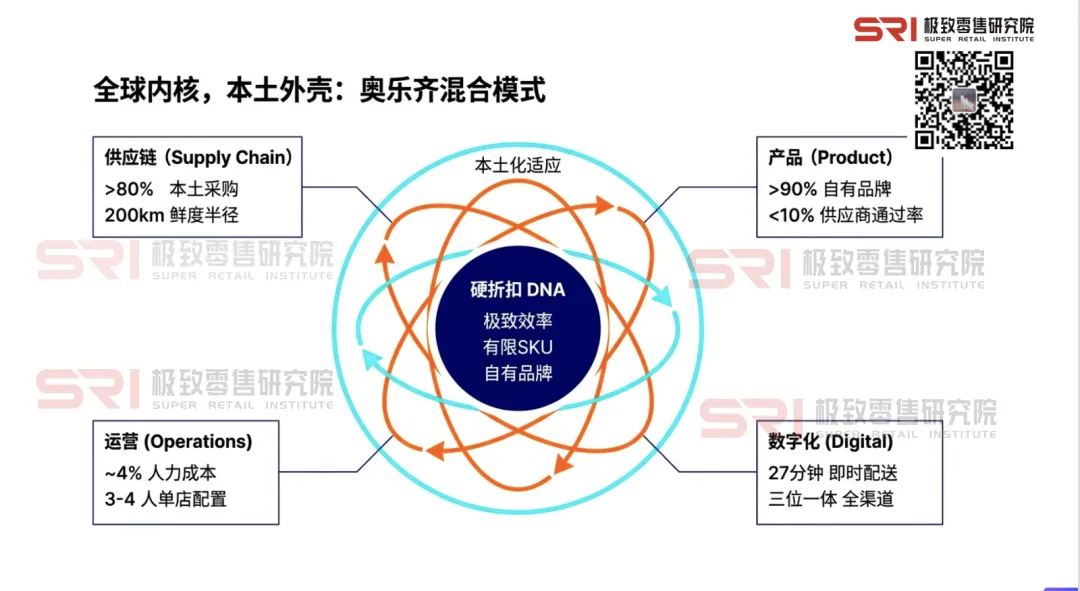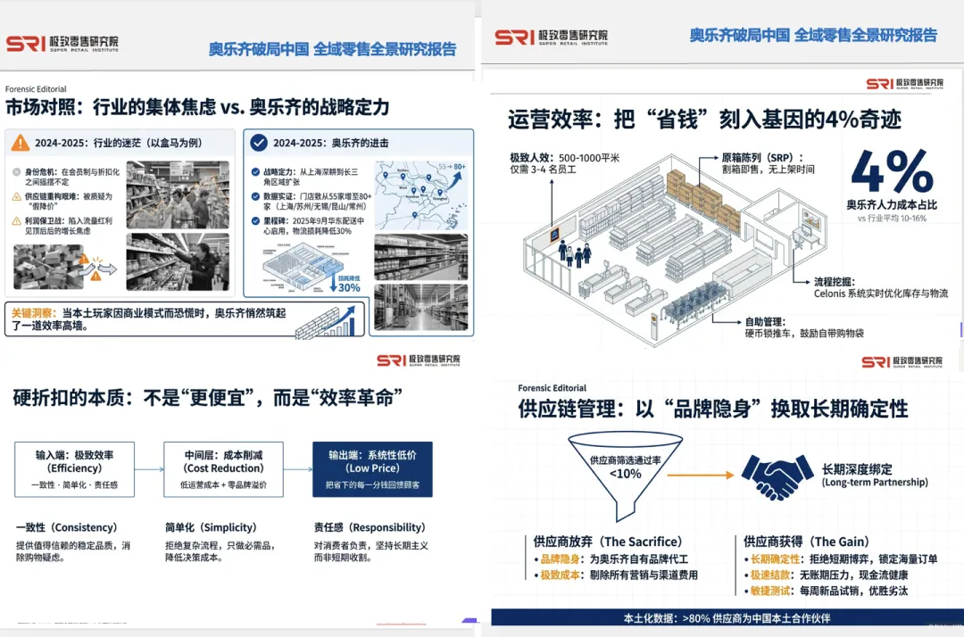 这份全景研究报告,试图解码奥乐齐在中国市场的“双重智慧”:一方面坚守源自德国的“全球内核”——极简SKU、自有品牌霸权、精益人效、深度供应链绑定;另一方面开展“精英式”本土化——为上海家庭定制牛奶规格、建立200公里鲜度半径、构建“门店+小程序+直播”的全渠道网络。
