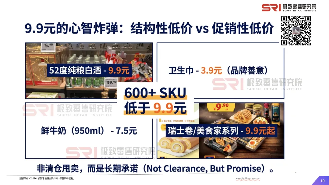 价格心智重塑:全年超700款产品长期降价,最高降幅45%。600余个SKU价格低至9.9元及以下,占整体SKU近1/3,包括7.5元鲜牛奶、9.9元白酒、3.9元卫生巾等“心智炸弹”。