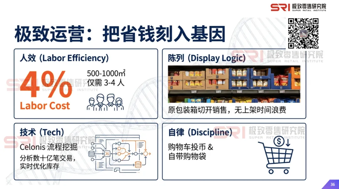 高效陈列与动线:商品以原包装箱切开销售,减少上架时间;门店设计简约实用,购物车投币使用,鼓励自带购物袋。