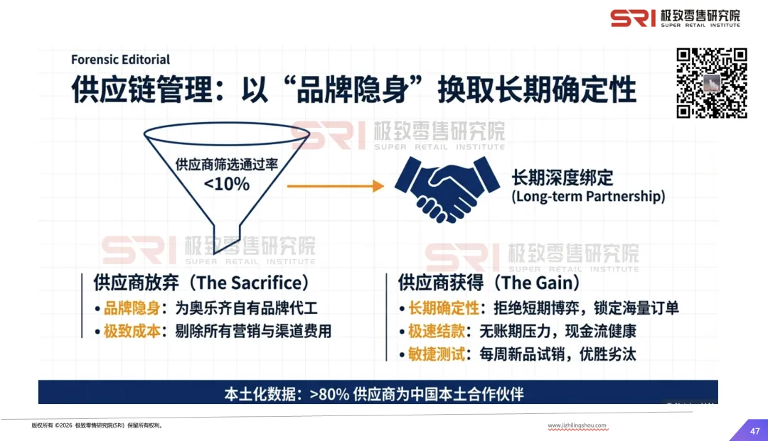 供应商战略同盟:供应商筛选通过率不足10%,要求“品牌隐身”,以长期、大批量订单换取极致成本优化。