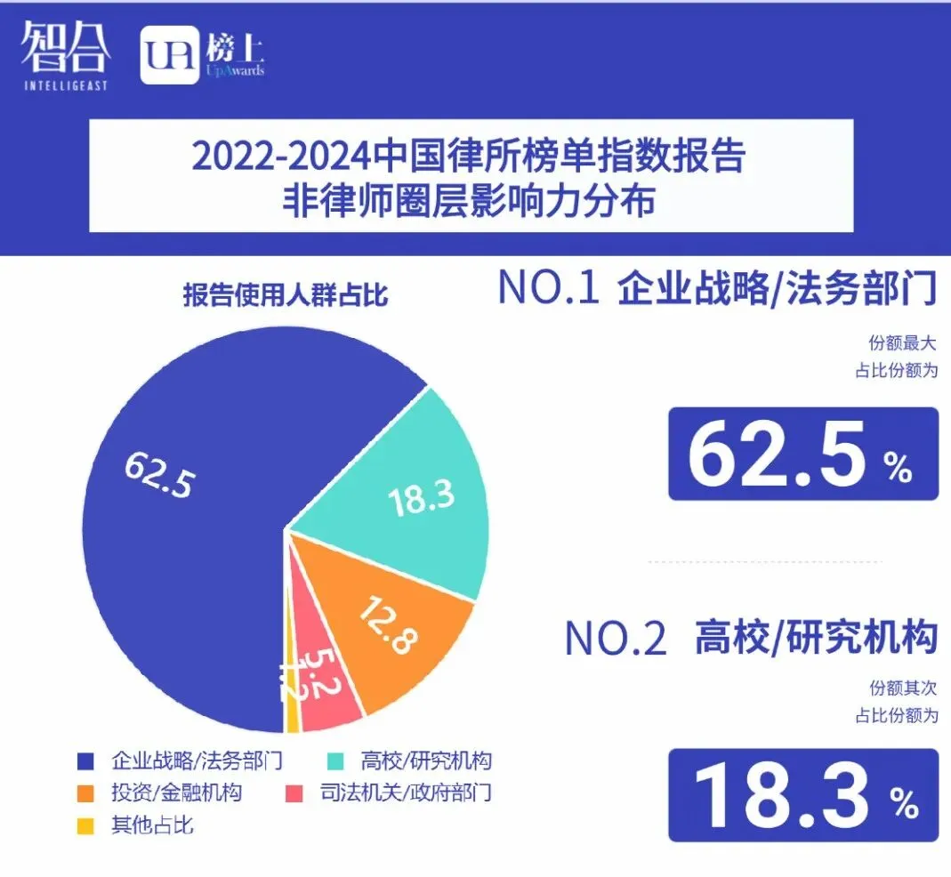 过去几年间,我们发布的系列报告影响力已突破律师行业,触达更广泛的决策与研究场景。累计共1171位来自企业战略、投资机构、高校、司法机关等部门的专业人士获取并引用报告。其中,企业决策者占比最高(超60%),他们或将其用于行业研究与服务商筛选,或作为招标采购中的专业参照。这份跨越圈层的认可,正是我们持续进行此项年度观察的根本意义所在。
