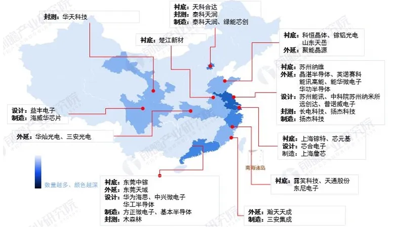 (四)国内第三代半导体产业情况。目前我国第三代半导体产业已经开始从“导入期”向“成长期”过渡,初步形成了从材料、器件到应用的全产业链,但在材料、晶圆、封装及应用等环节的核心关键技术和可靠性、一致性工程化应用领域与国际顶尖水平还存在较大差距,部分高端产品还是空白,高度依赖国际进口。然而,第三代半导体属于后摩尔定律概念,对制程和设备要求相对不高,能够避免前两代半导体发展过程中出现的发达国家通过限制光刻机、干法刻蚀机出口而产生的“卡脖子”局面。国内产业界和专家普遍认为在第三代半导体领域是我国摆脱集成电路被动局面,实现芯片技术赶超和超车的良机。从区域上来看,目前,国内多个省市出台政策支持第三代半导体产业发展,在京津冀、长三角、珠三角、成渝等区域已经形成了较为成熟的产业集群。中国半导体行业协会评选的2022年全国第三代半导体最具竞争力10大产业园区,长三角地区3家,分别为苏州工业园、上海临港新片区、无锡国家集成电路设计中心;泛珠三角地区2家,分别为深圳宝安区第三代半导体IDM产业园、厦门高新区;成渝地区2家,分别为重庆西永微电子产业园、成都高新区;京津冀地区2家,分别为北京顺义区、河北鹿泉经济开发区;中西部地区1家,即西安高新区。从龙头企业来看。目前,国内第三代半导体主要制造商共147家,主要分布在江苏、广东、北京。碳化硅产业链相关公司共104家,其中上市公司15家,全产业链企业(生产设备、衬底、外延、器件)有三安集成、中电科55所、中电科13所等。氮化镓产业链相关公司有43家,其中上市公司3家,全产业链公司仅有英诺赛科1家。从重大项目投资来看。近年来,国内龙头企业发展态势迅猛,在下游器件环节多个细分领域取得关键技术突破,已经具备了与国际龙头企业竞争的技术实力。比如,英诺赛科建成中国首条8英寸硅基氮化镓外延与芯片大规模量产生产线,截至目前已经实现超过1亿颗氮化镓芯片的出货量,有望在今年实现全球出货量第一;山东天岳在半导体绝缘型碳化硅衬底市场出货量国内第一、全球第三。