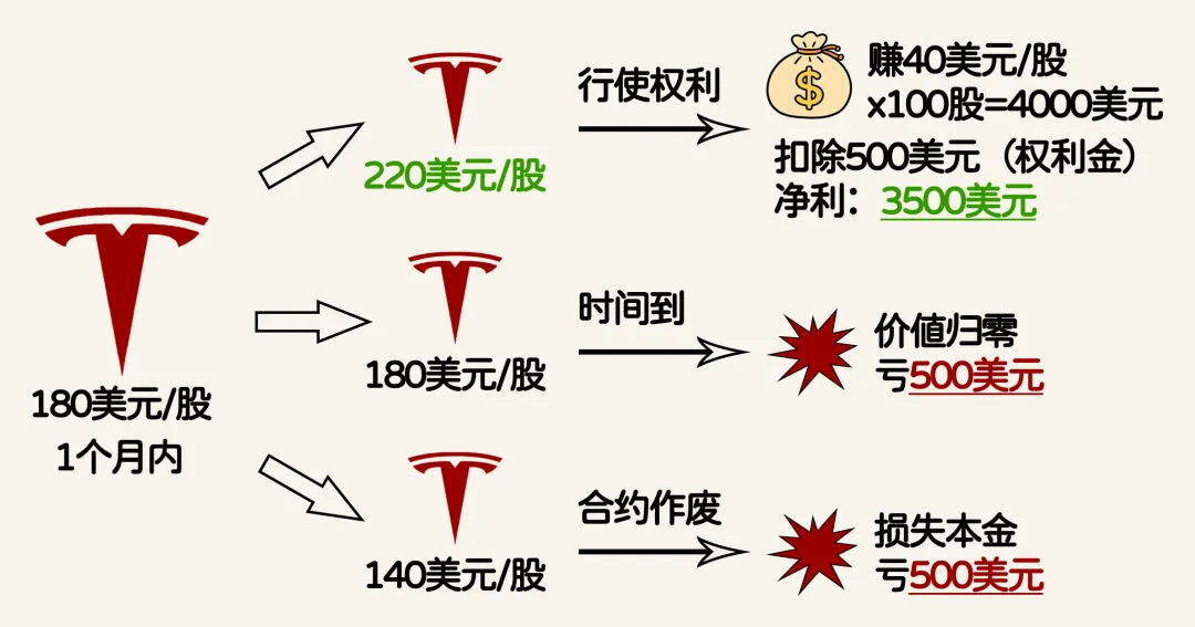 一个月后(股价大涨):特斯拉涨到220美元。你行使权利,以180美元买入市价220美元的股票,每股赚40美元,扣除5美元权利金,净赚35美元/股。你的500美元(权利金)变成3500美元(净利),收益放大7倍。 一个月后(股价不动或下跌):到期股价低于或等于180美元。合约毫无价值,你将损失全部的500美元(权利金)。