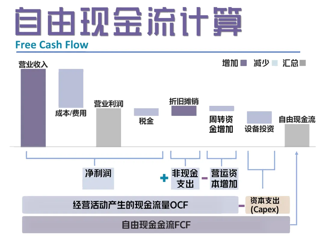 自由现金流:公司经营中真正能自由支配的现金。比利润更能反映真实健康度(因为利润可以被会计手段调节)。
