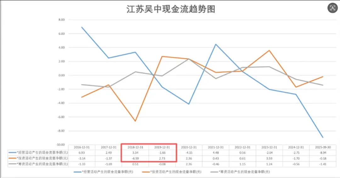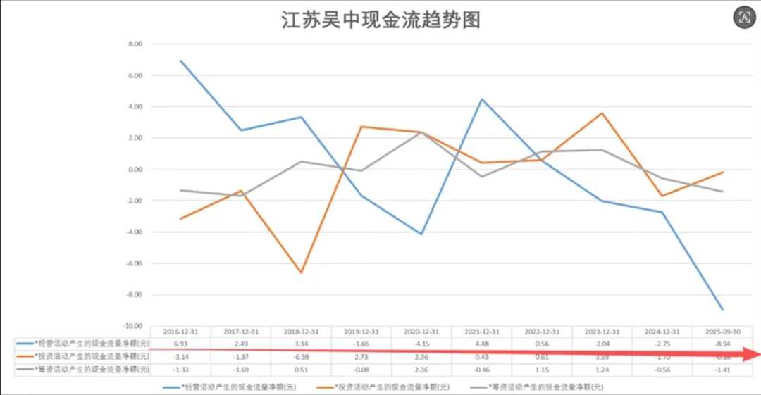 经营现金流由正转负,且持续恶化。,2016年经营现金流6.93亿,2025年三季度。暴跌至-8.94亿。,2020年至2024年也连续为负,说明核心业务不仅不赚钱,还在持续烧钱,无造血能力,投资筹资现金流难掩颓势,投资现金流大起大落,2018年-6.59亿,2019年2.73亿。反映盲目投资后仓促变卖资产。
