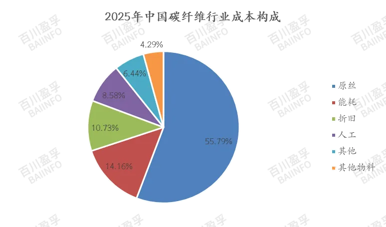 碳纤维行业成本主要由碳纤维原丝、能耗、折旧、人工等方面构成。其中碳纤维原丝占比最大,根据2025年统计数据,碳纤维成本中原丝占比高达55.79%,因此企业原丝配套情况及原丝生产过程中辅料的自主生产情况尤其重要;其次电费也是企业降本的重要考虑因素之一,部分北部地区由于电力资源丰富成为企业新增产能的优选;另外提升生产线幅宽及纺速、增加单线产能、降低吨折旧、吨能耗、吨人工等方面也将为企业降本增效提升竞争力。