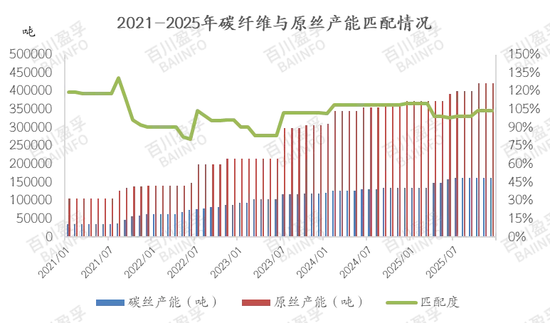 从国内碳纤维与原丝供需角度来看,2025年两者匹配度基本实现100%,但目前仍存部分企业需外采原丝,生产成本稍高。