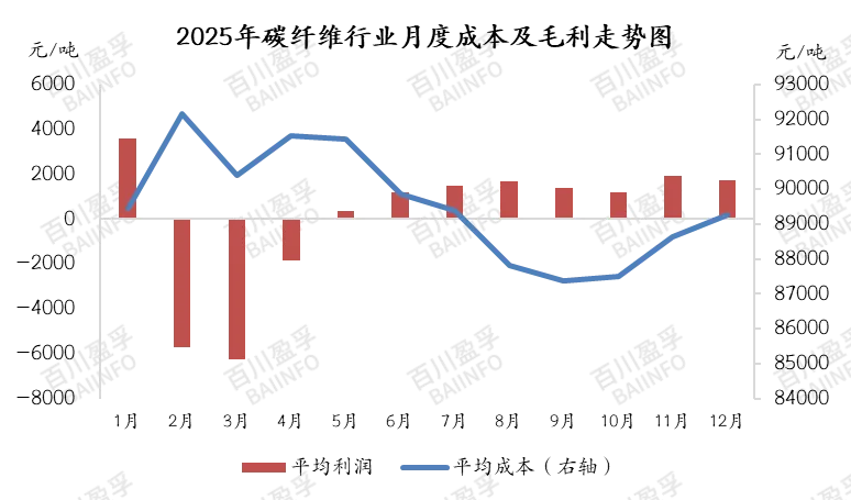 丙烯腈作为碳纤维原丝的主要原料,2025年,丙烯腈华东港口平均价格8748元/吨,同比降幅6.71%,同时国内碳纤维原丝价格下降、企业成本优化,行业平均生产成本环比下降约6000元/吨,降幅6.67%。利润方面,自2023年下半年起,碳纤维行业平均利润持续维持低位,2025年,碳纤维行业处于盈亏边缘,较去年相比盈利略有减少。
