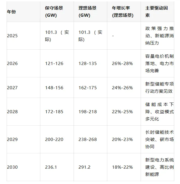 中关村储能产业技术联盟预测,"十五五"期间新型储能装机将持续增长,到2030年,在保守场景下累计规模达236.1GW(2025-2030年年复合增长率CAGR 20.2%),理想场景下可达291.2GW(年复合增长率CAGR 24.5%)。这一增长趋势主要受以下因素驱动: