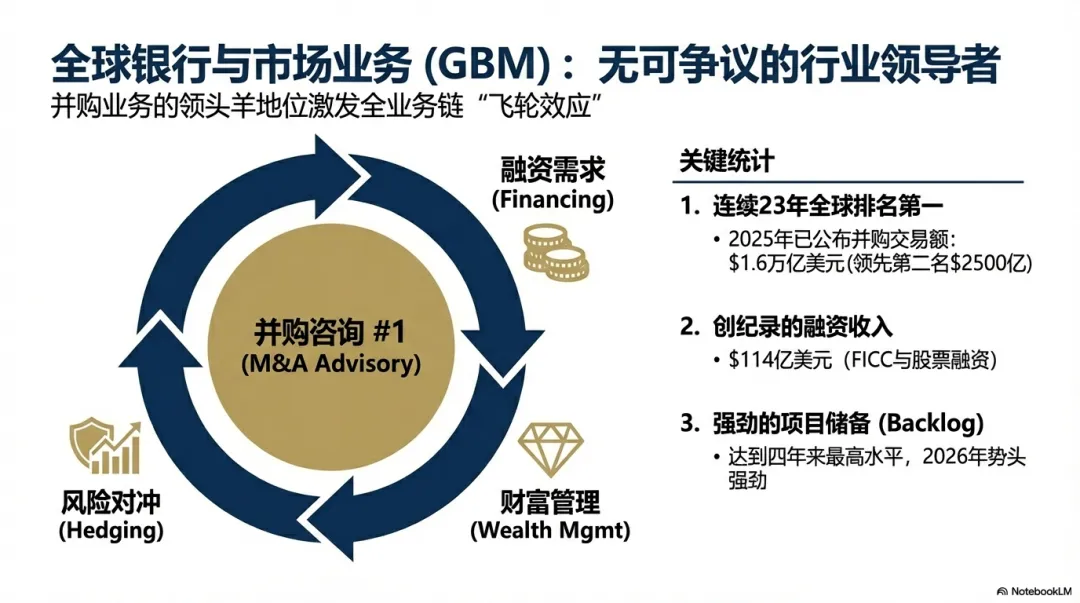 高盛的第一台引擎,仍然是它最传统、也最具统治力的板块——全球银行与市场部(GBM)。其中最值得单独拎出来的,是并购业务。