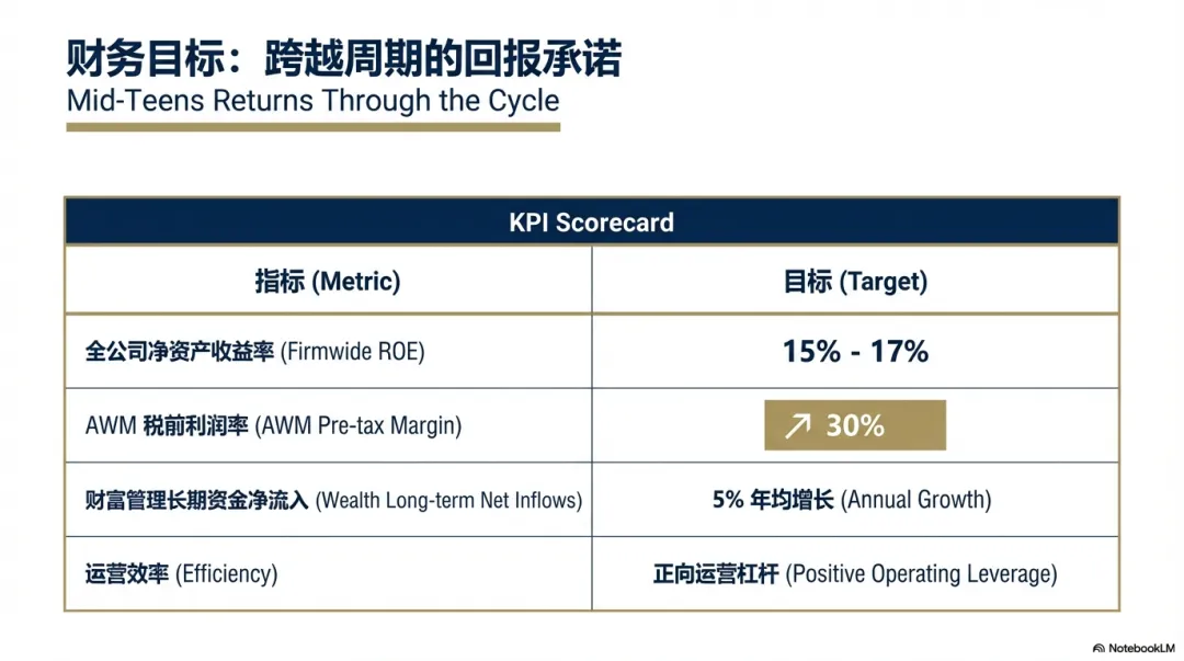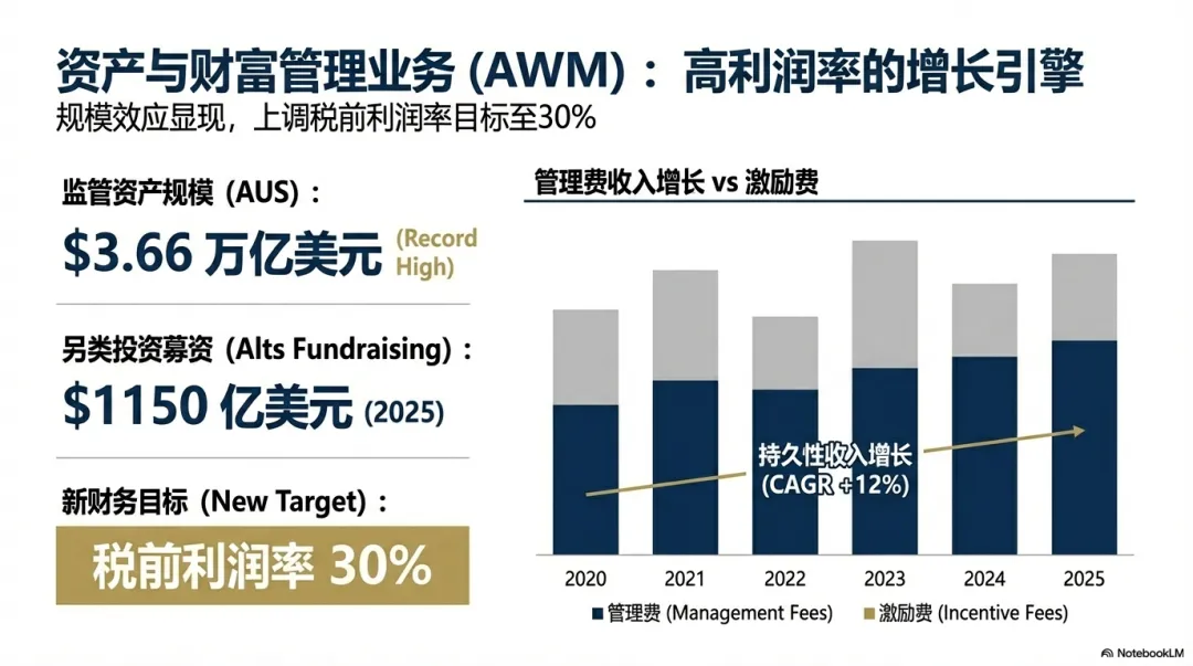 为了强化这一叙事,高盛给AWM设定了更激进的新目标:税前利润率要达到30%,并且收费型资产净流入每年增长5%。这不是温和的优化,而是明确的增长野心。