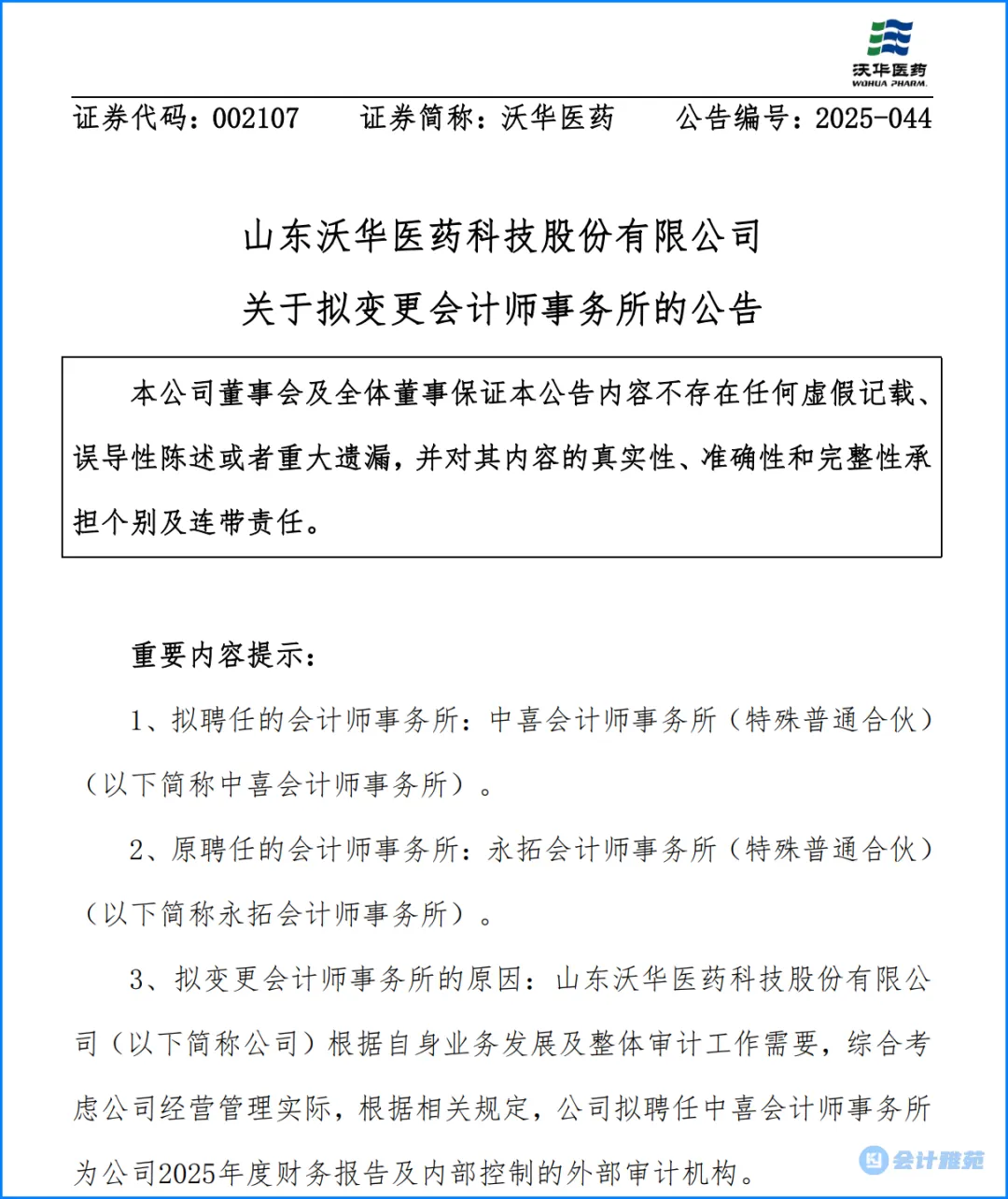 2025年11月,沃华医药发布变更会计师事务所的公告,2025年年报审计机构由永拓会计师事务所变更为中喜会计师事务所。
