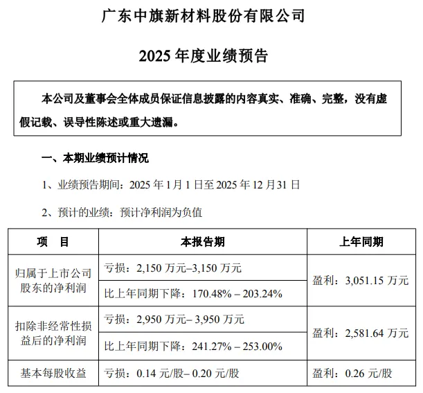1月15日,A股上市公司中旗新材发布全年业绩预告,公司预计2025年1-12月业绩预亏,归属于上市公司股东的净利润为-3150.00万至-2150.00万,净利润同比下降203.24%至170.48%,预计基本每股收益为-0.2至-0.14元。
