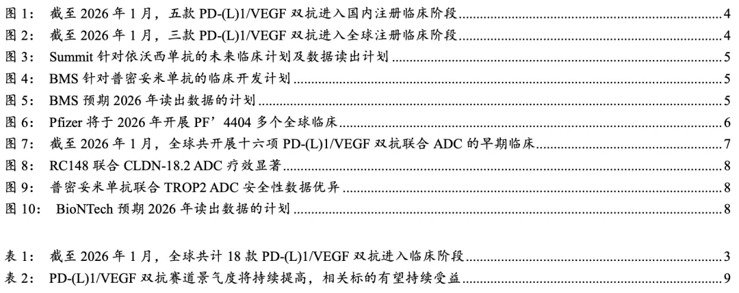 PD-(L)1/VEGF双抗作为有望迭代PD-(L)1单抗市场的下一代IO基石药物,已有五款国产BD出海。2026年MNC有望加速开展全球临床,同时或有多个POC数据及关键临床数据的读出,赛道景气度将持续提高,相关标的有望持续受益。