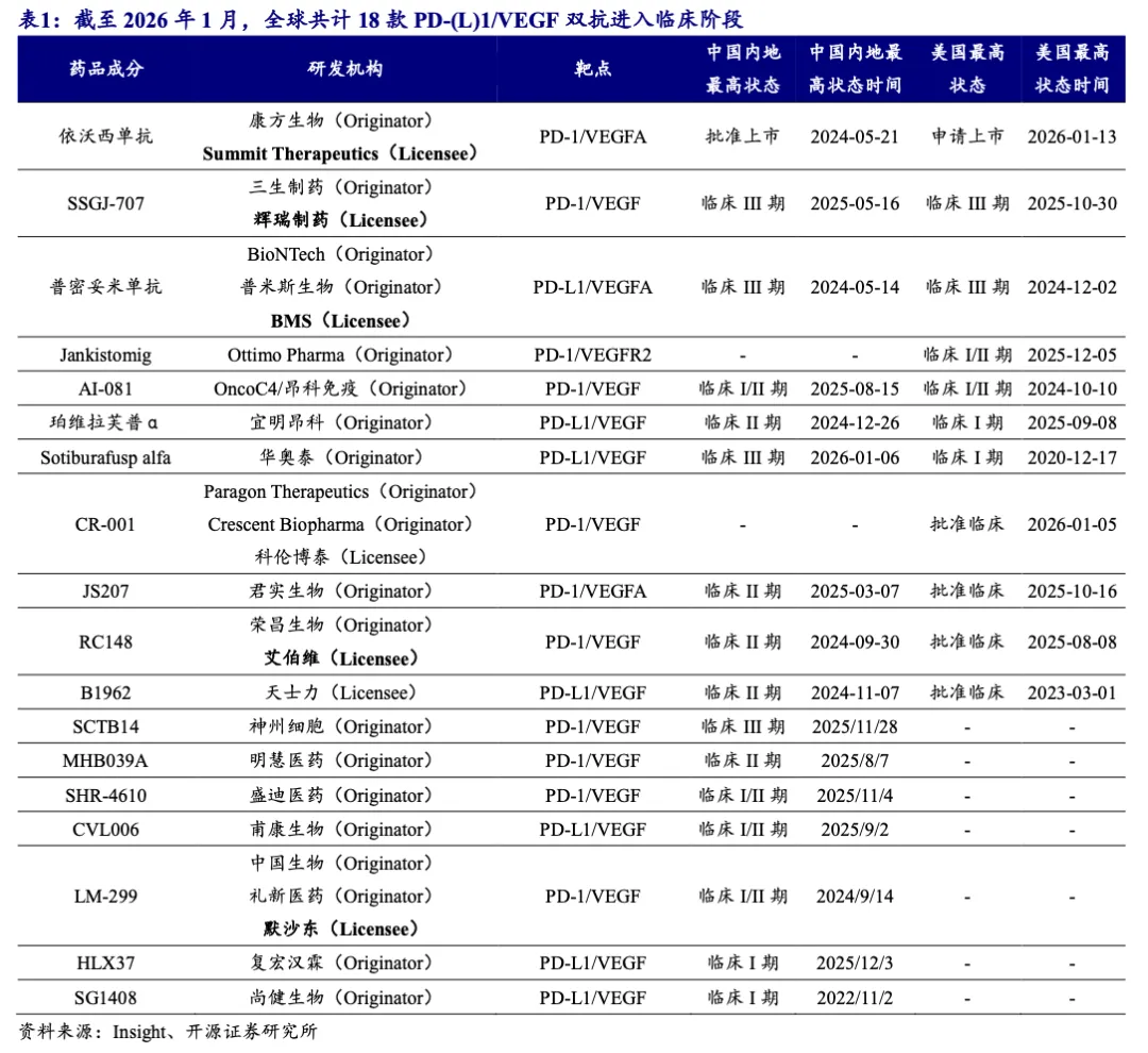 目前全球共18款PD-(L)1/VEGF双抗进入临床阶段,其中5款国产已BD出海。截至2026年1月,全球共计18款PD-1/PD-L1双抗进入临床阶段,相较2025年年中新增4款。