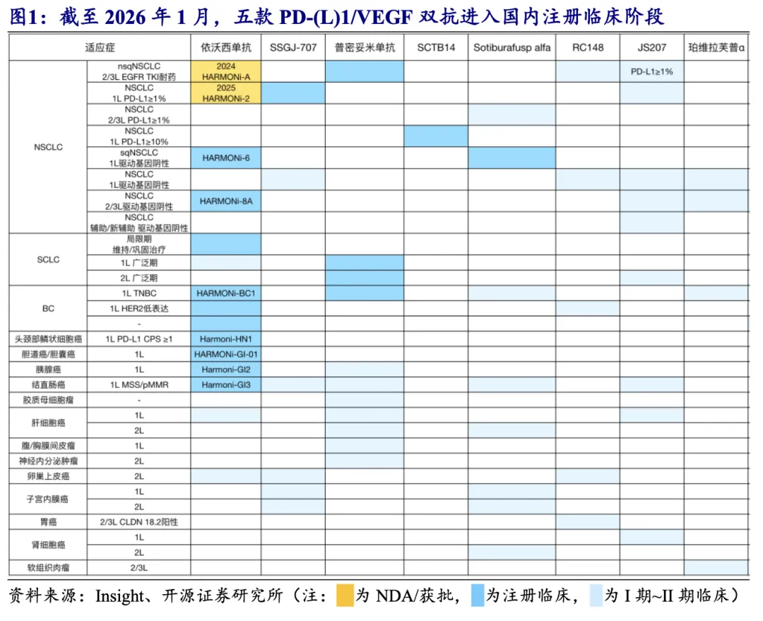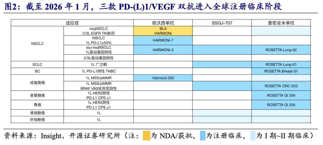依沃西单抗:目前围绕NSCLC进行全面布局,2025H2新开一项针对一线结直肠癌患者的美国注册临床。近期,Summit于2026 JPM大会披露,2026Q1有望继续开展一项全球注册III期临床,2026H2有望读出HARMONi-3鳞癌队列患者PFS和中期OS数据。