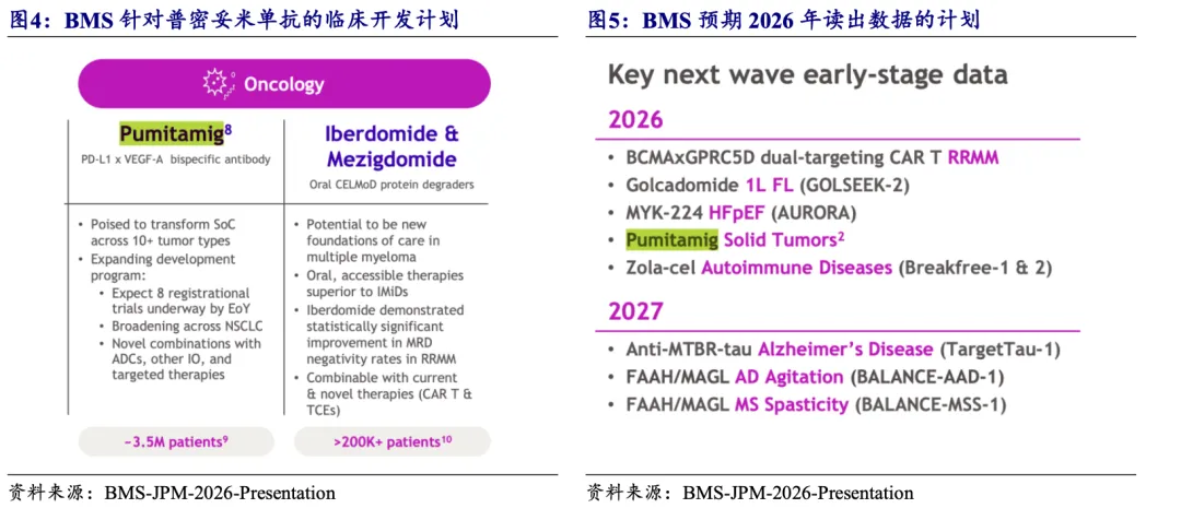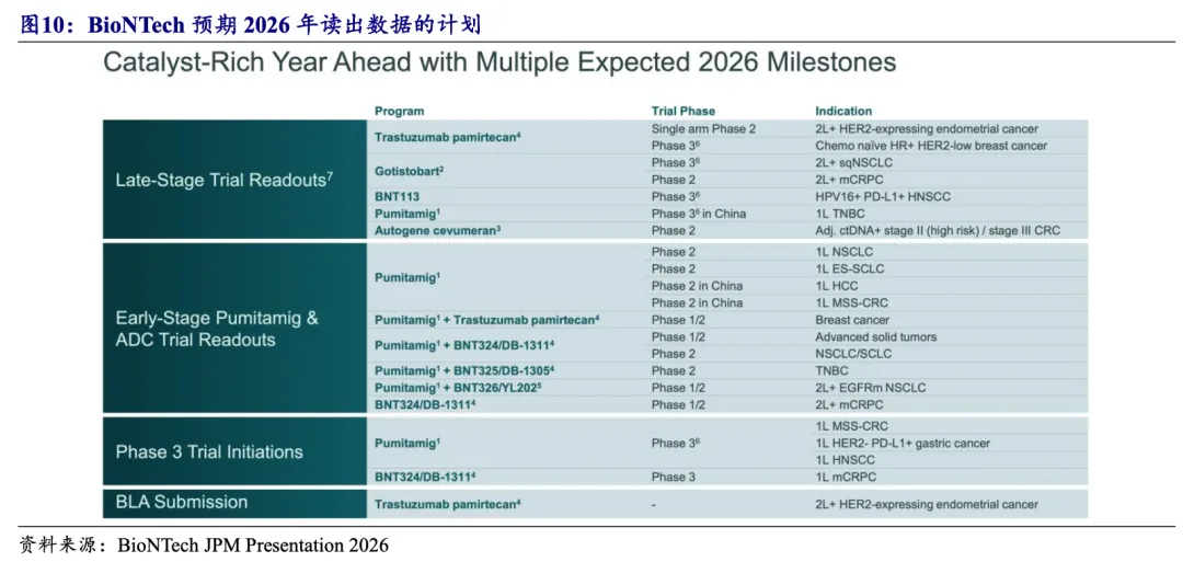 普密妥米单抗:已开展六项全球注册临床及多个早期探索临床;BMS及BioNTech于2026 JPM大会披露,预计到2026年底前将开展8项针对普密妥米单抗的注册临床,并有望在2026年读出多个临床数据,包括一项国内注册临床(1L TNBC)和多个早期临床数据(包括多个联合ADC临床)。